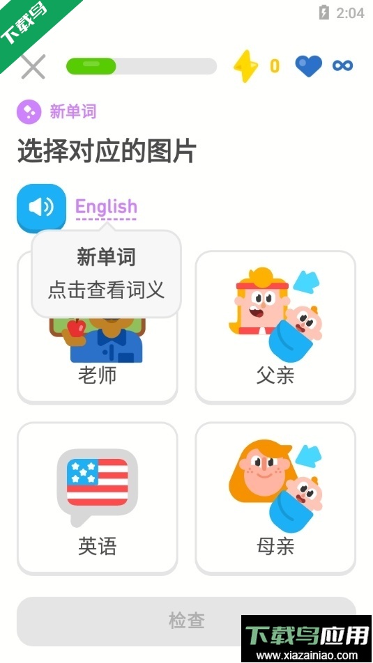 2、完成基础课程,跟随系统指导进行单词识别和句子配对,通过看图选词、听音辨义来培养初步语感。
