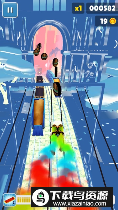 3.实用道具支援:场景中散落着加速鞋、磁铁和护盾等多种道具,助你突破纪录。