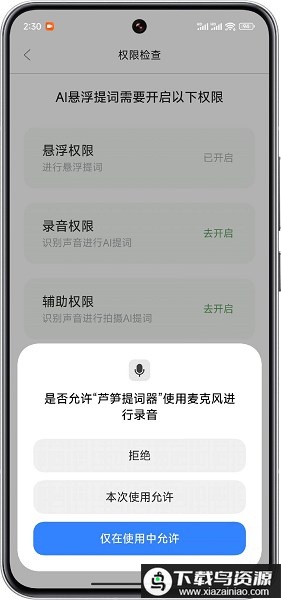 若想在悬浮提词时启用智能跟读模式,还需开启录音权限;操作较为简单,在权限检查页面点击录音权限旁的“去开启”,选择“仅在使用中允许”即可完成。