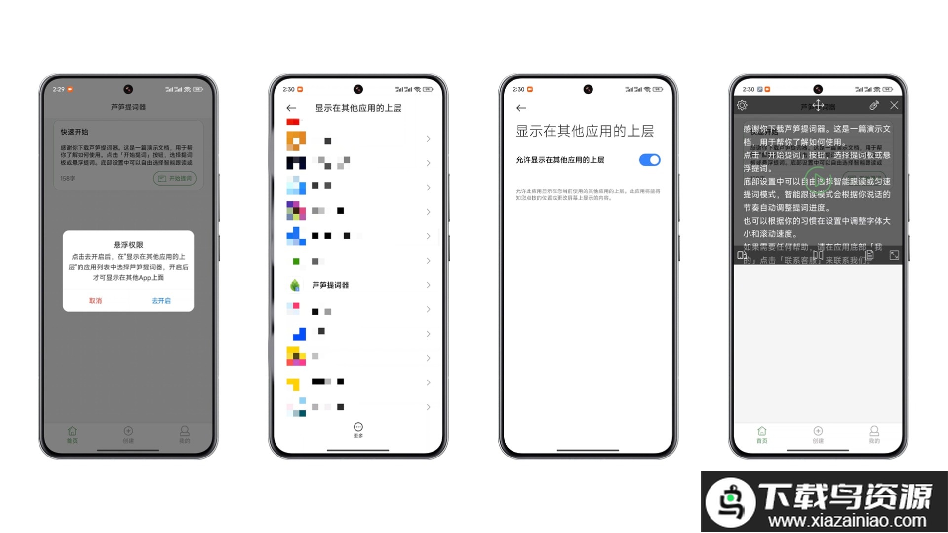 首次尝试悬浮提词时,应用会提示开启悬浮窗权限;请点击提示框内的“去开启”按钮,在系统设置中找到“显示在其他应用的上层”列表,从中定位“芦笋提词器”并打开其开关;完成设置后返回应用,即可看到悬浮提词窗口。