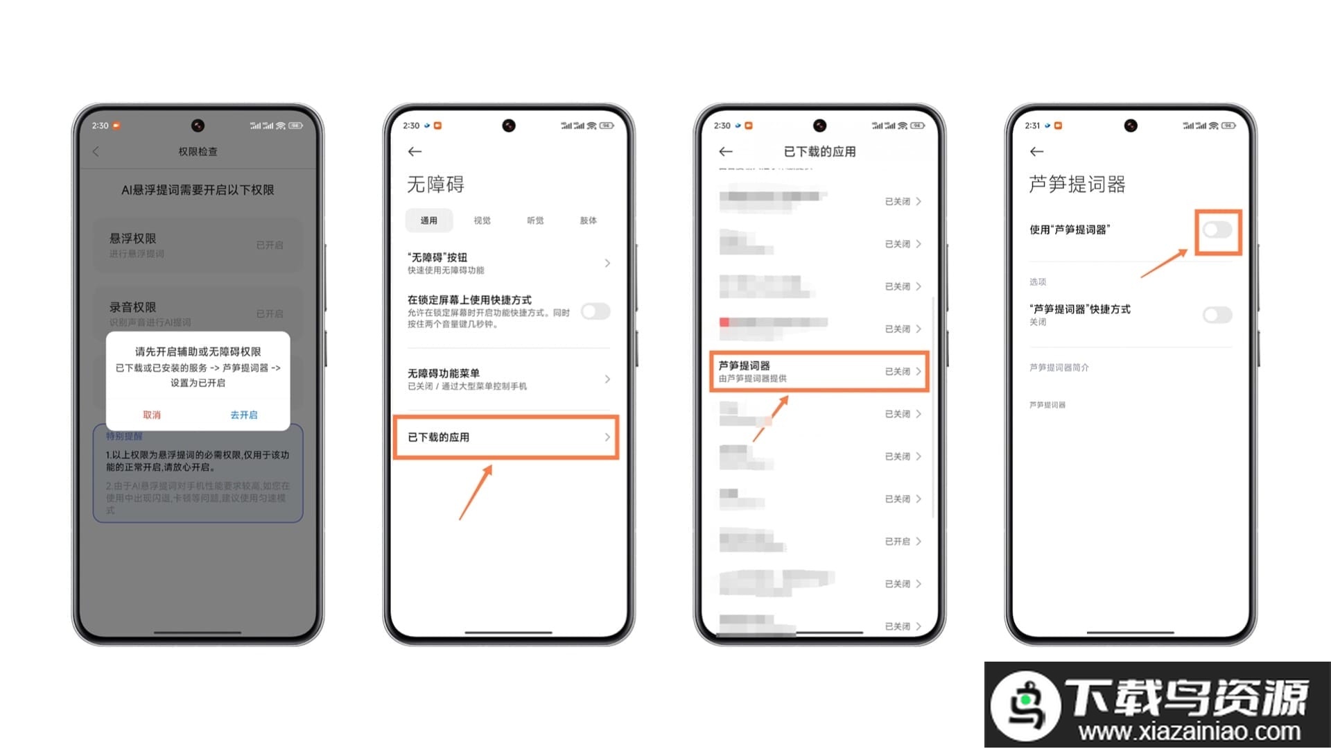 开启无障碍权限步骤稍多,不同手机品牌的设置界面略有差异;以小米手机为例,在权限检查页面点击辅助权限的“去开启”,进入系统“无障碍”设置页,选择“已下载的应用”(部分手机可能显示为“已安装的服务”或直接列出应用列表),在列表中找到“芦笋提词器”并打开其开关即可。