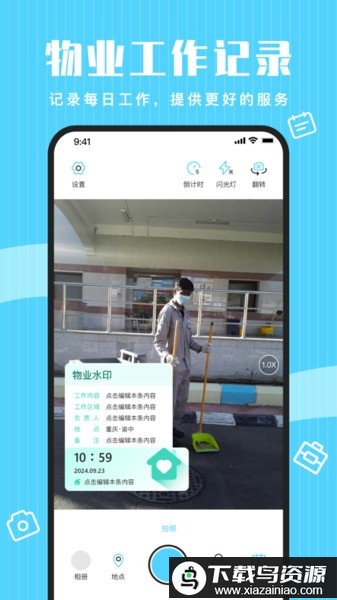 软件包含考勤打卡、工程记录、电路巡检及出差记录等多种适用于各行业工作场景的水印模板,无论是拍照还是录制视频都能使用;水印的具体内容可以自由选择显示或隐藏,用户也能对水印文字进行自主编辑。