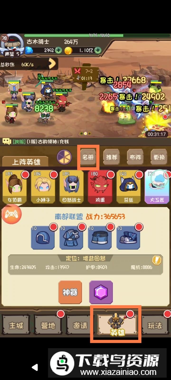 1. 这款游戏吸引人的点在于:熟悉的魔兽英雄情怀,以及需要策略搭配阵容且调整阵容没有任何消耗。所有英雄最终都有机会获得,这点很重要;某些关卡需要根据敌方特点灵活变阵,例如试炼中遇到专攻后排的敌人,可以将常规前排英雄换到后排进行抵挡;面对高防御单位,需要上阵具备减益或无视防御能力的英雄;遭遇群体嘲讽敌人时,治疗若按百分比回复反而会帮助敌人,此时需更换治疗方式。因此,建议先浏览英雄图鉴,了解强力英雄并构思搭配。查看路径:英雄-名册-图鉴。