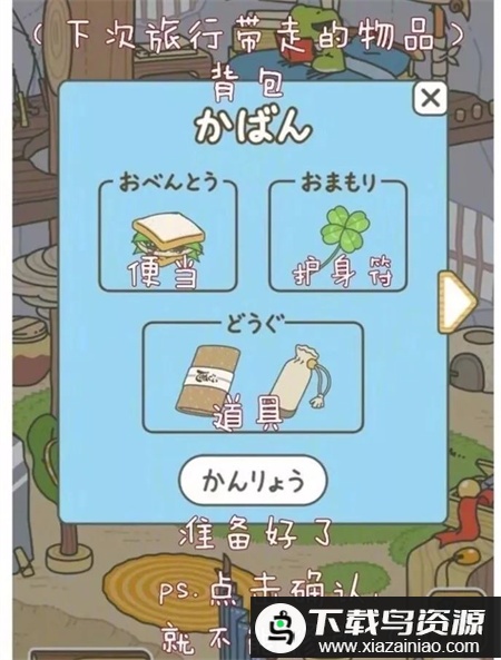 黄色背景区域是桌面摆放区,同样包含便当、护身符和道具,提前放好青蛙下次出门便会自动携带,避免遗忘,注意不要点击最下方的按钮。