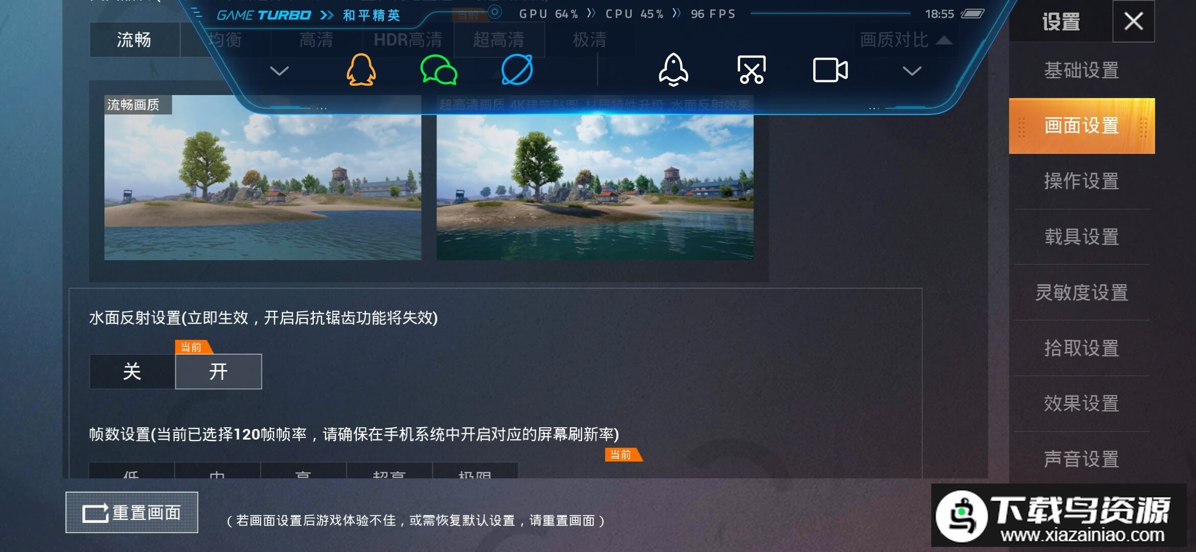 5.画面帧率可根据设备性能选取,若屏幕刷新率本身不支持120Hz,选择120FPS效果可能有限。