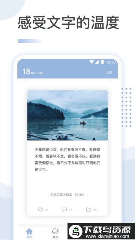 这里专注于呈现精美、文艺而知性的文字,你可以静心品读;为你的短视频寻找恰当文案,一段好文字能让视频迅速吸引目光。没有繁杂的页面设计,也没有复杂的社交功能,只聚焦于文字本身的美好,打造属于每个人的心灵驿站。