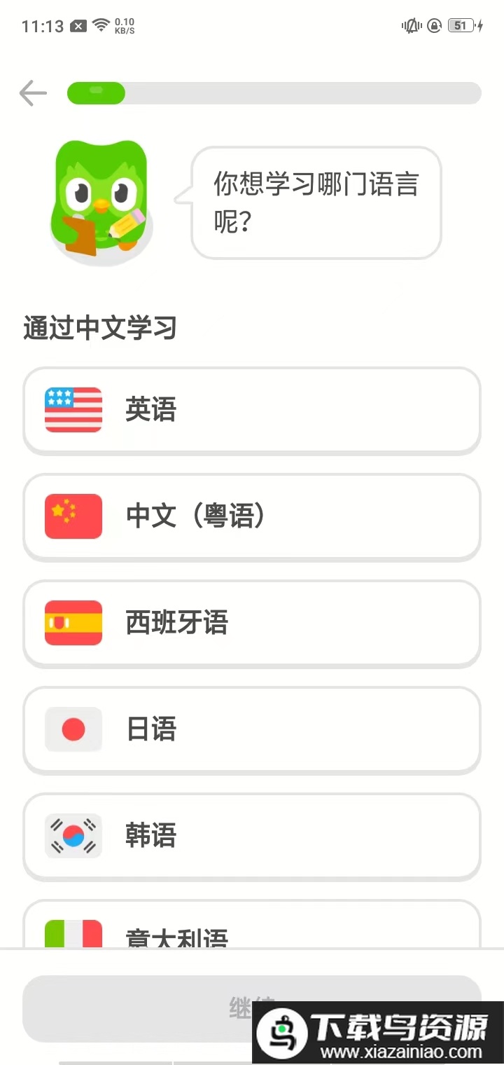 1、启动应用后,新用户需要先选择目标学习语言,例如英语。
