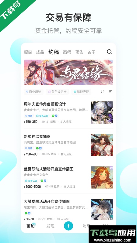 画加是一款面向美术爱好者与专业从业者打造的委托对接应用,该平台致力于构建一个可靠、流畅且安全的在线创作环境,帮助用户快速寻找到风格契合的绘画创作者,携手完成独具个性的艺术项目。