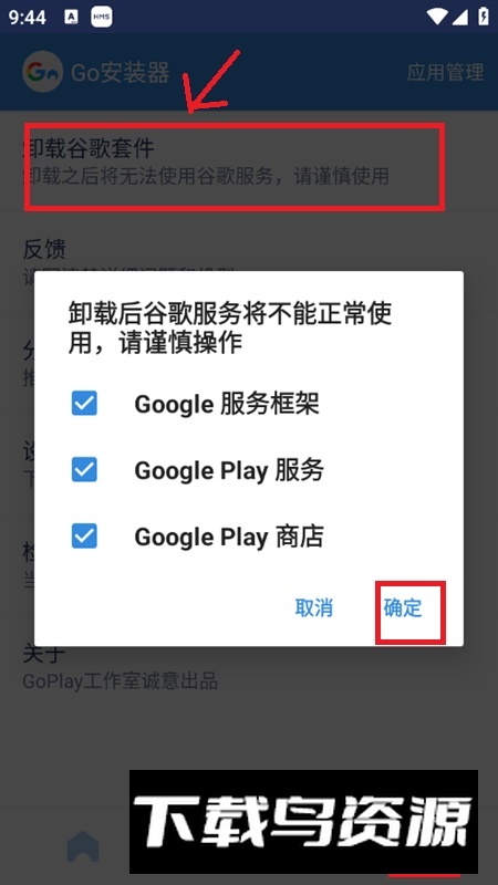 4. 如需卸载谷歌服务框架,可重新进入go谷歌安装器内选择卸载功能。