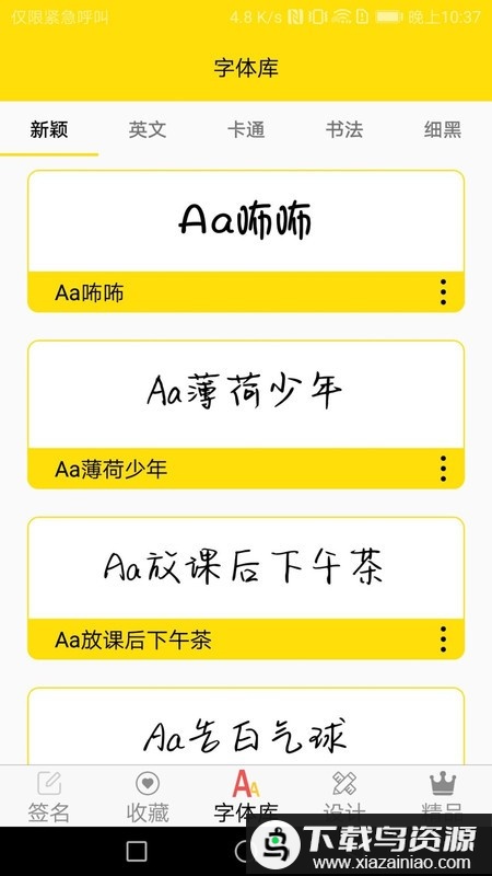 免费字体app为用户提供手机字体美化服务,内置丰富的字体库并保持实时更新,包含新颖字体、英文、卡通、书法及细黑体等多种风格;用户可一键收藏心仪字体,也能利用设计工具搭配特效创作个人字体,并有机会在精品区展示作品。