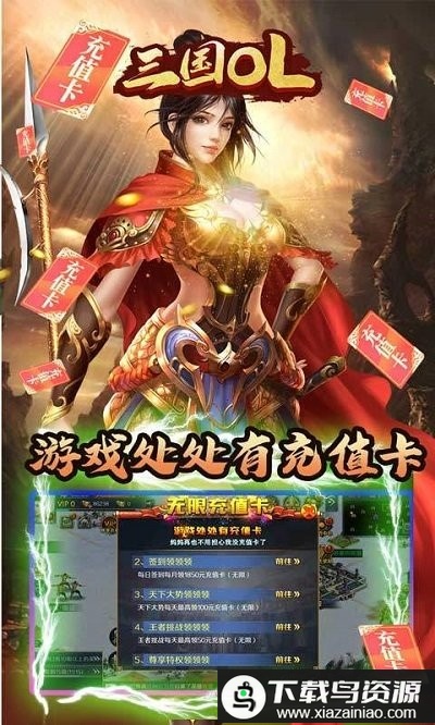《三国online》重现经典三国战场,新版简化操作,可指挥多路名将,结合回合制与即时国战策略;地图广阔真实,支持多部队行军,战斗体验丰富,内政玩法多样。创建角色即享SVIP1特权、88连抽及大量福利包,开局资源充沛。达到指定等级和登录累计赠送超过十万元充值卡;游戏内各处都有充值卡赠送,多种玩法均可免费获取。每日在线赠送百次抽奖机会,稀有道具和海量充值卡轻松获得,带来全新感受!