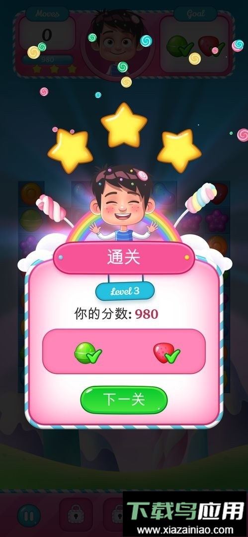 点击屏幕上三个相同的物体即可完成消除,操作完美可获得更高分数;随着关卡等级提升,题目难度也会逐渐增加。收集足够的糖果纸就能兑换金币,还能领取丰富的随机任务奖励。