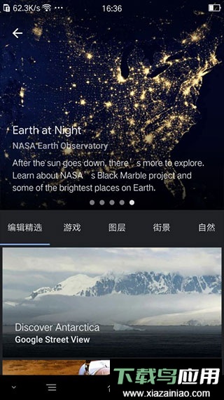3、在展开的侧边栏中,找到并选择“Earth at night”选项;