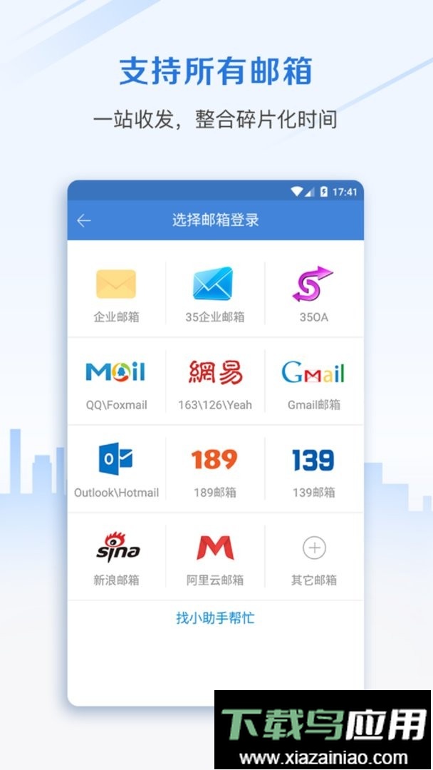 支持腾讯QQ、新浪、搜狐、阿里、雅虎、126、139、189、Gmail、Hotmail、Foxmail、Outlook等各类个人邮箱账号。