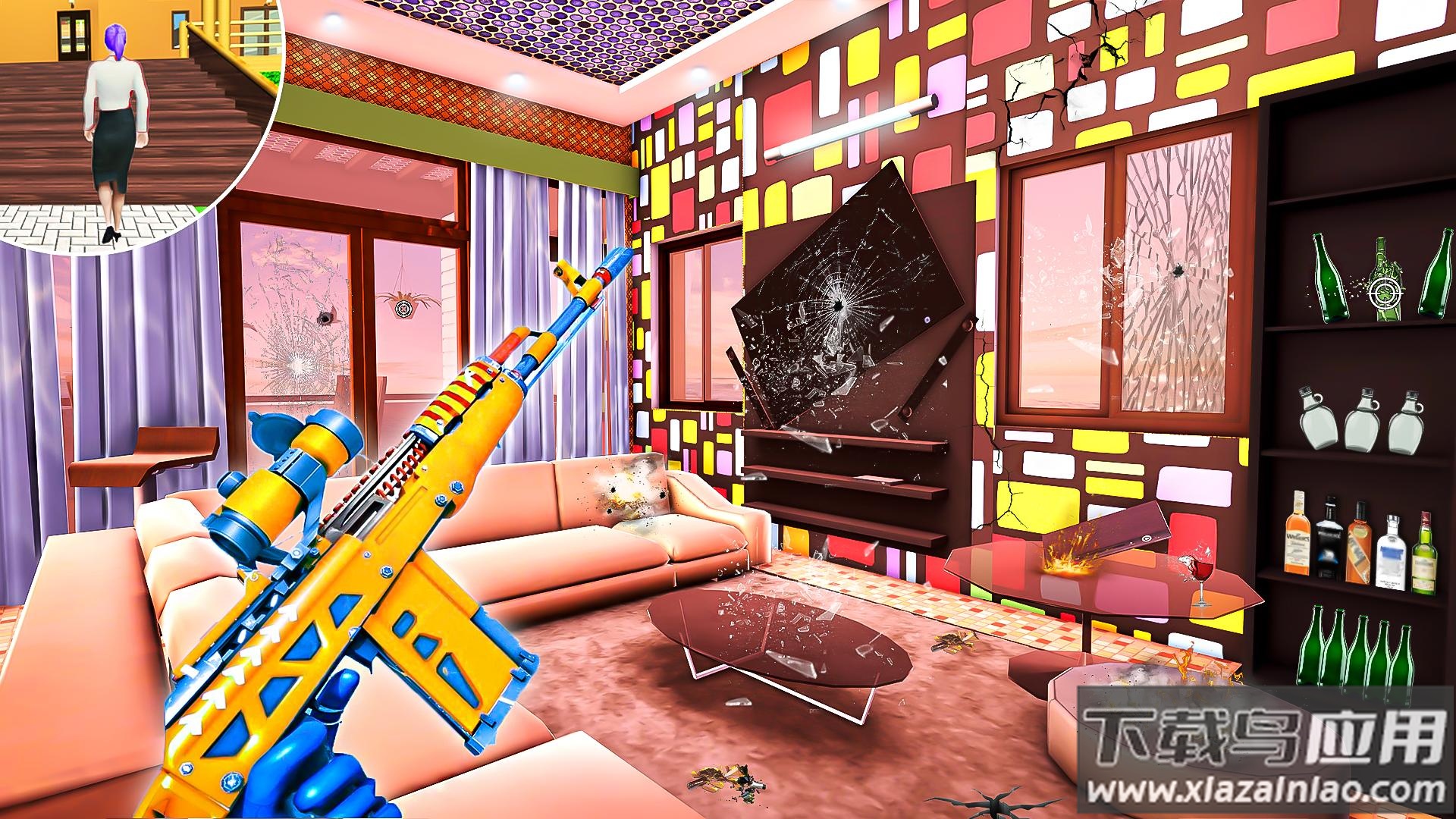 这是一款以房屋射击破坏为主题的游戏。你需要趁可怕的老师到来前潜入屋内,摧毁地图指定的目标物品。注意不要击中带有红色标记的物体,否则会被老师抓住导致关卡失败。游戏设置了时间与弹药限制,增加了破坏过程的挑战性与趣味性。