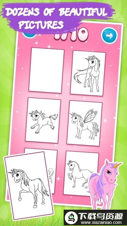 它不仅仅是一款涂色游戏,孩子们除了能为预设的独角兽图案上色,还可以自由绘制马匹和其他图画。游戏中收录了大量小马宝莉相关图片,可以说它也是一本不错的小马涂色书。无论是男孩还是女孩,都能在这本图画书中找到乐趣;同时,游戏中还能遇见许多童话故事里的奇妙生物。