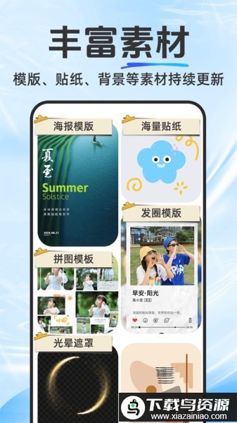 海量的模板、贴纸及背景素材库,内容持续更新。