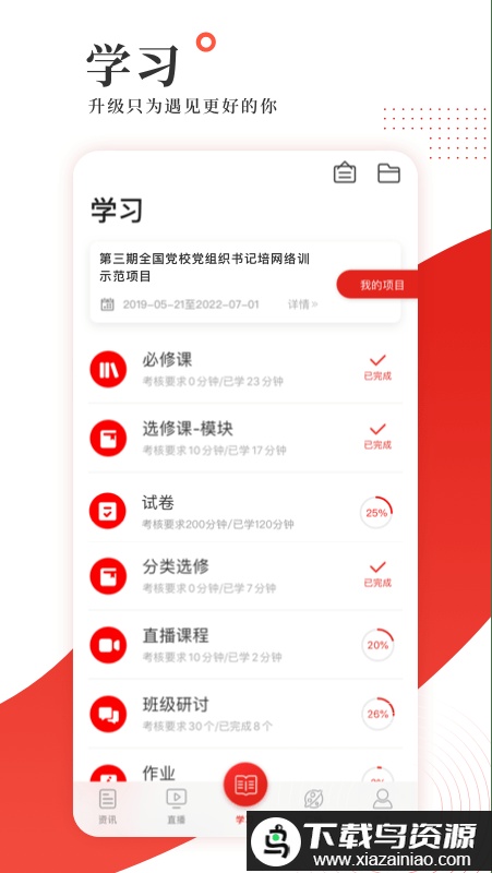 3.学习:进入该板块可参与已报名的培训项目,并完成课程学习与相应的考核环节。