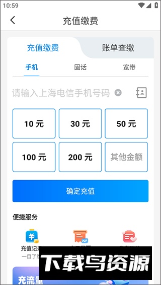 打开并登录上海电信官方app,在首页点击充值缴费入口;