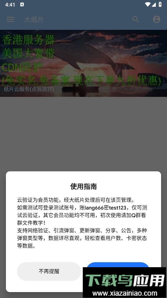 云验证服务属于会员专属功能,经过大纸片处理后的应用可在此页面进行管理。如需进行功能测试,可使用测试账号登录,账号为lang666,密码为test123;此账号仅限测试云验证功能,其他会员权益均不可用。建议新用户加入官方社群,查阅群文件中的详细教程以便快速上手。该工具支持网络验证、引流弹窗、更新提示、分享功能、公告发布等多种弹窗类型;后台数据展示较为直观,可以方便地查看用户数量、卡密状态等关键信息。