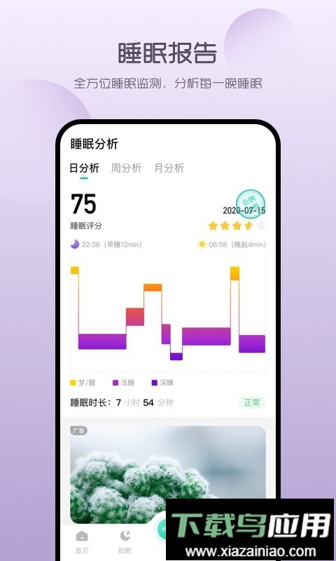 应用通过分析睡眠期间的动作幅度与环境声音来判定睡眠阶段,仅需利用手机内置传感器,无需额外穿戴设备。使用时请将手机置于枕边,避免放在坚硬物体上;建议可开启飞行模式以减少干扰。