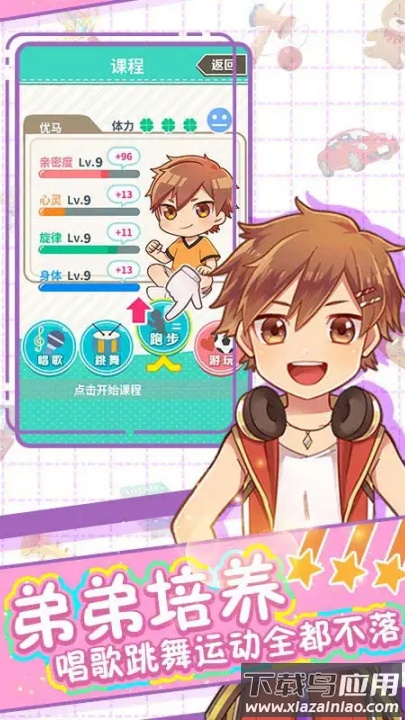 这次回到家乡,身份忽然从看护爷爷变成了三个可爱男孩的临时家长。核心目标是协助他们登上音乐祭的盛大舞台。喜欢萌系养成、钟情弟弟或正太角色的朋友千万别错过。通过安排课程提升弟弟们的才艺,歌唱、舞蹈、运动都能增强相应能力。他们情绪低落时,一起玩耍是最好的调节。增进感情需要体贴互动,比如轻柔抚摸或准备小礼物。亲密度提高后,还能开启有趣的休闲小游戏。就这样与弟弟们朝夕相处,一起朝着音乐祭的光彩时刻迈进吧!游戏操作轻松简单,轻点屏幕就能和弟弟们交流。共同上课学习,闲暇时玩游戏加深情感,在筹备演出的过程中,享受与三位弟弟相伴的温馨日常。