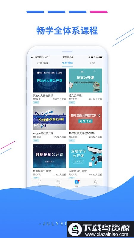 七月在线是国内知名的人工智能学习平台,其课程体系完整,并推出了国内首批人工智能专项题库。平台提供众多免费且高质量的课程内容,所有教学均注重工程实践,强调通过真实数据、案例与代码来驱动学习。