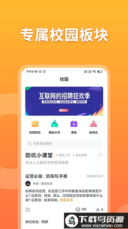 【校园板块】该板块汇集了丰富的校园招聘专属职位;用户可通过识别自己所在学校,直接对接与校园合作的企业,使得求职过程更高效、信息更精准可靠。