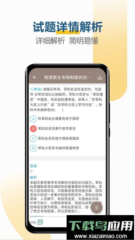 软件收录了历年完备的历史高考题目,配备答案与详细解析,帮助学生深入理解历史事件;其模拟考试功能可随时检测学习成效,有效提升应考能力。