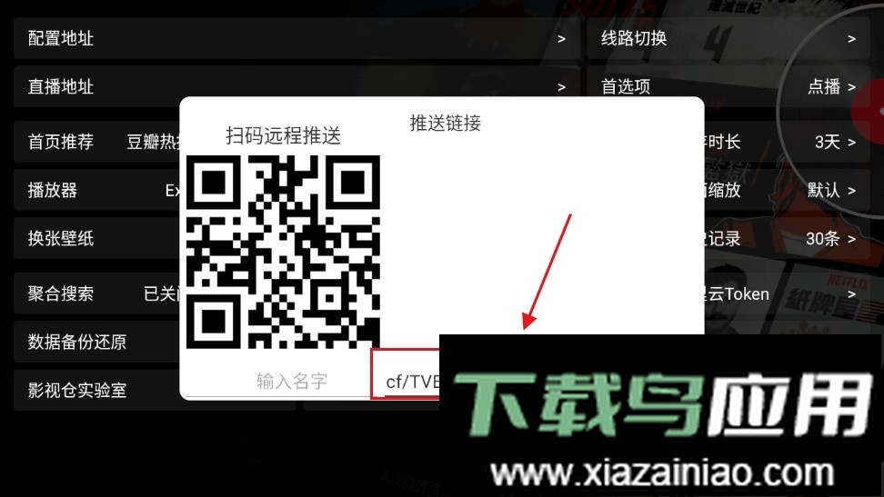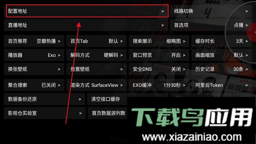 在配置地址栏中输入以下地址:http://pandown.pro/tvbox/tvbox.