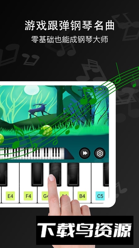 软件内置了88键真实钢琴音色,完整还原了标准钢琴键盘;并通过结合趣味游戏与分步教学的方式,循序渐进地指导用户学习弹奏。