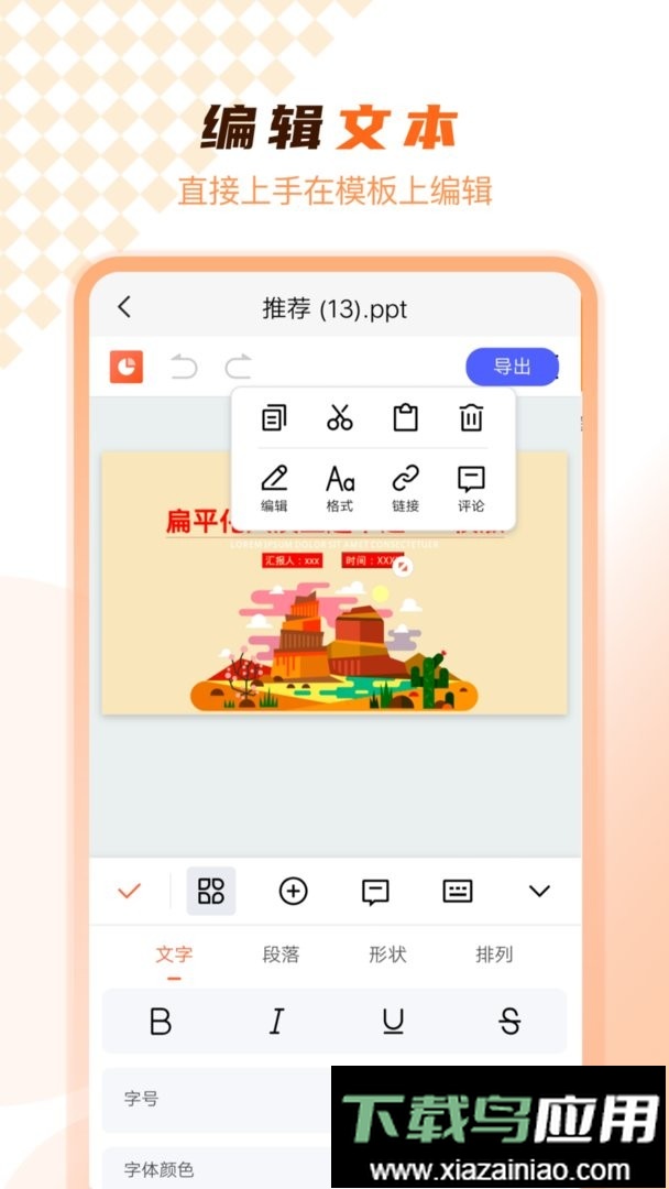 用户可在线自由编辑,自定义字体等元素,使幻灯片更加出彩;