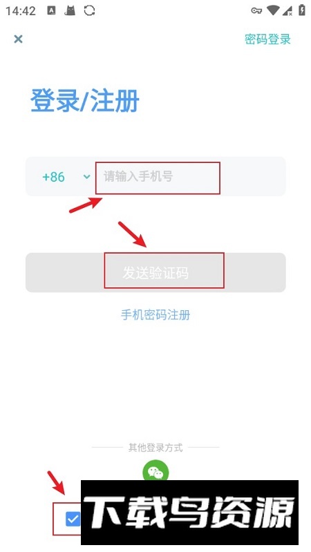 2、启动应用后选择手机号码完成注册。