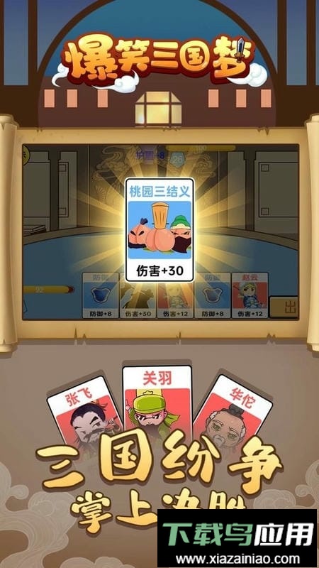 这款游戏将经典三国人物进行卡通魔性改编,创造性地融合了闯关与卡牌收集玩法,带来新颖体验。每张角色卡牌属性各异,需要你合理搭配与合成,以此培养出更强大的战力。根据敌方阵容派出克制的卡牌即可获胜,过程看似简单,实则非常考验你的布局技巧与临场策略。现在就来尝试一下吧。