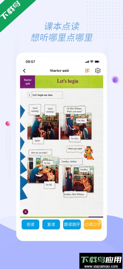 课本听说读:兼容多种主流教材,具备点读、连读、复读、跟读功能;可放大课文句子并查询单词释义,助力小学阶段英语学习。