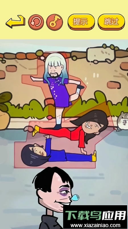 这是一款休闲益智游戏,你的任务是协助蓝色妖姬与朋友们摆出各种古怪姿势,以逃脱追捕。通过点击角色切换动作,让蓝色妖姬能够完美隐藏在石块或其他物体后方。