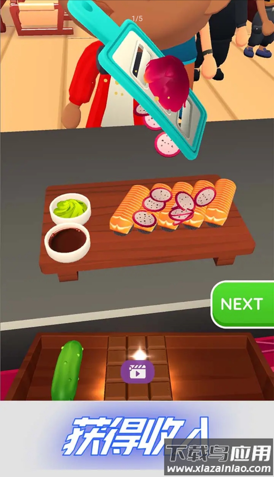 4. 使用鱼、米和海藻等经典材料,随着游戏推进,你还能获得辣椒、榴莲和鱼子酱等特殊配料。自由组合来创作不同菜式,如寿司、生鱼片、握寿司和面条等。