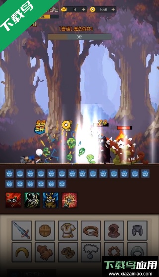 1、开局选择基础武器与技能,角色会自动在横版关卡中战斗并推进,从而获得经验与装备;