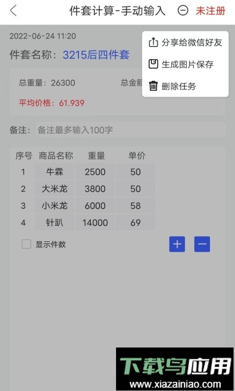 件套计算器是一款工具类软件,核心功能是快速计算一组产品的平均价格,目前主要应用于冻品行业。软件既支持通过图片识别表格数据,也允许手动输入产品信息。计算完成后,结果可以生成图片并分享给他人。