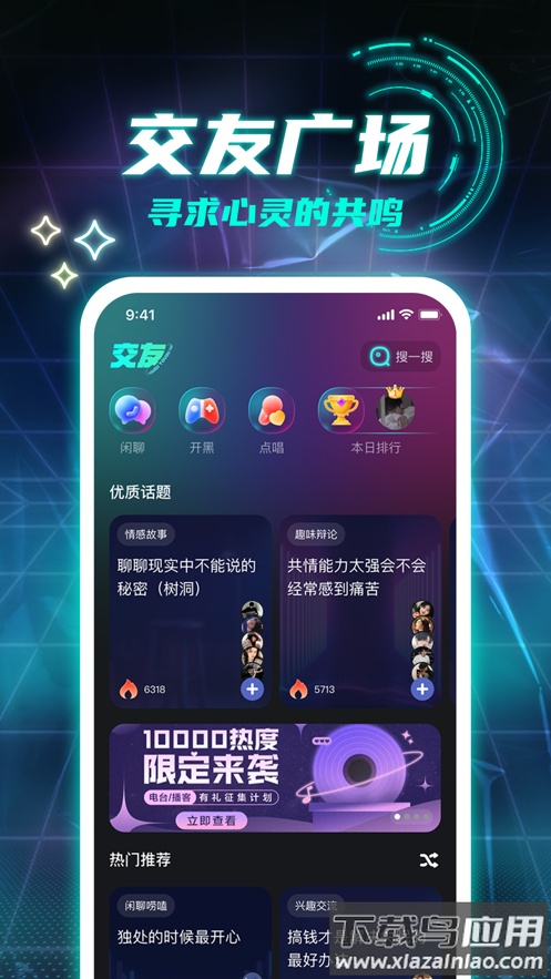 在这里你可以认识新朋友,加入各种话题的聊天,也能收听精彩的音乐和娱乐内容。