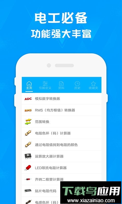 支持计算线路压降、电流、电压、有功功率、电机转速与效率等关键参数;包含四色环电阻、五色环电阻及电感色环的计算解读;有助于学习电工基础知识、低压配电安装、同步发电机原理等;几乎囊括了电工作业中所有需要计算的项目。