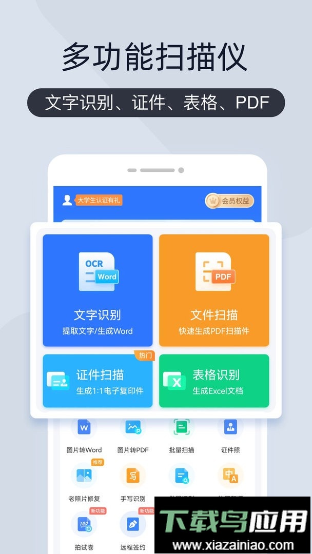 能够扫描识别各类文件、图片、书籍与名片等,并提取其中所需文字,用户可对识别内容进行编辑与复制;
