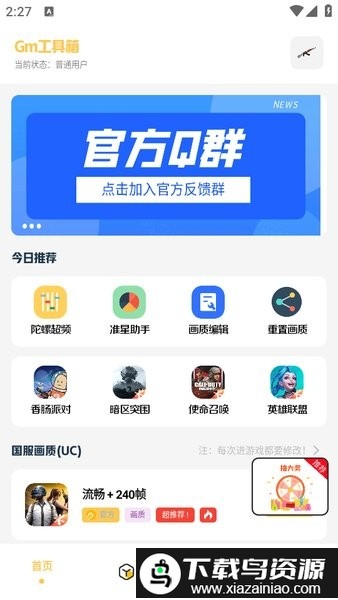 1、打开gm工具箱app,在首页的国服专区里,点击任意画质选项右侧的开启按钮;