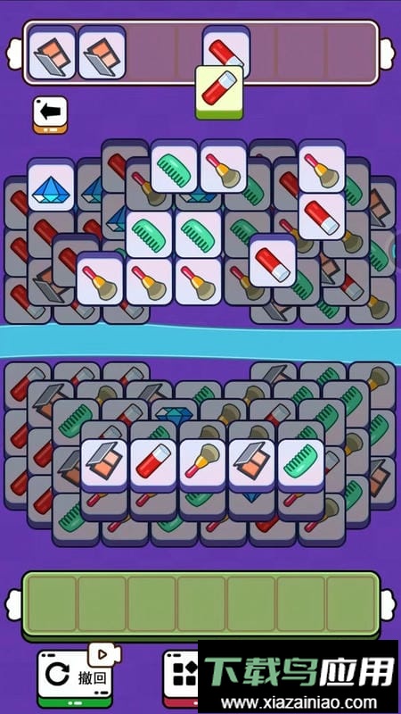 玩家需寻找并点击三个相同图案的方块以完成消除,直至清空所有方块方可通关;若未能消除的方块占满所有位置,则游戏失败;过程中有三种特殊道具可助力闯关。