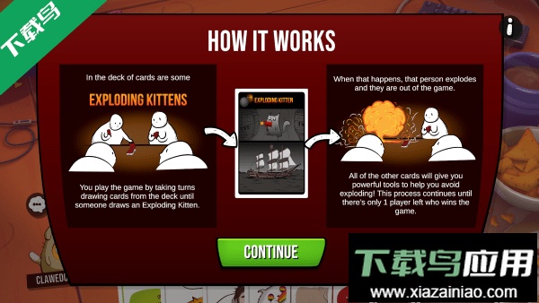 爆炸小猫2是一款以抽卡为核心玩法的休闲策略卡牌游戏,继承了前作的经典设计并加入新元素。游戏风格轻松诙谐,节奏明快,支持二至四名玩家同台竞技;玩家需要运用策略与运气,避开爆炸猫卡牌,成为最后的胜利者。画面采用卡通风格,卡牌动画生动有趣,操作简单容易上手,适合不同年龄段的玩家。每回合玩家需从牌堆抽牌,若抽到爆炸猫且没有拆弹卡,则会立即出局;玩家要通过各种手段避免抽到爆炸猫,或是利用拆弹卡挽救危局,最终存活下来。游戏还支持语音交流与趣味互动,适合朋友聚会或线上对战。
