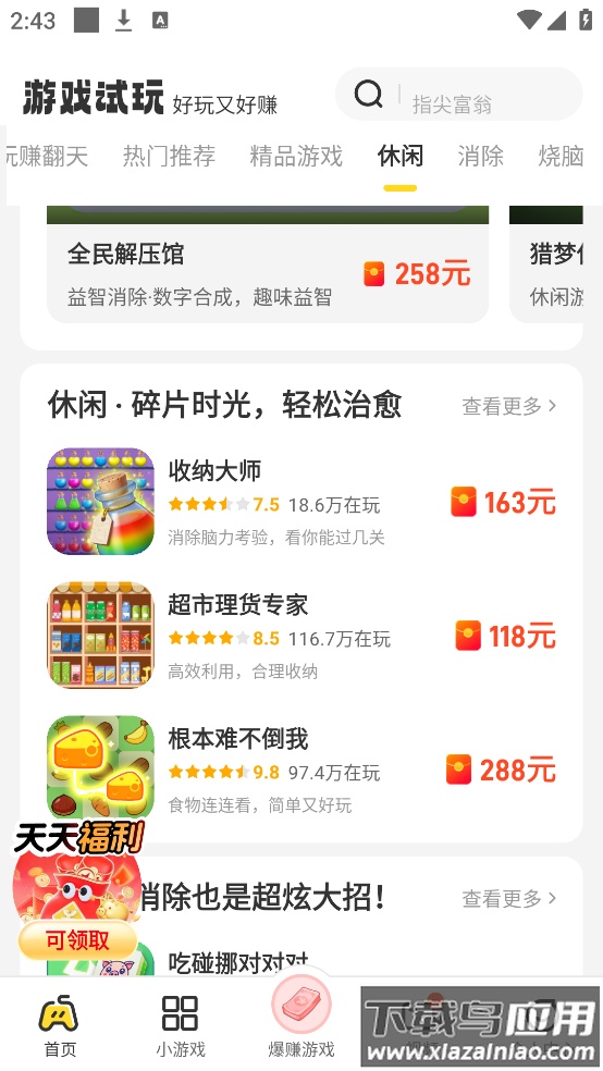 乐享集盒是一款带来轻松乐趣的手机游戏应用,里面准备了大量好玩的小游戏。这些游戏多数设有红包奖励,让你在休闲娱乐的同时还能积累一些小小收益。应用内游戏种类丰富,你可以轻松找到自己感兴趣的那一款,边玩边收获惊喜。