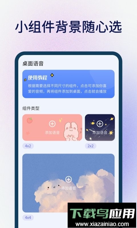 桌面语音小组件app是一款方便实用的手机桌面互动工具,它为用户提供了丰富多样的个性化组件选择,支持自由编辑与设置,让每个人都能按照喜好搭配背景样式,轻松打造出独具特色的手机桌面视觉效果。
