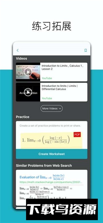 代数功能包括求解一元二次方程、方程组与不等式,支持代数式运算和线性方程作图;微积分领域可进行求和、求极限、导数与积分计算。