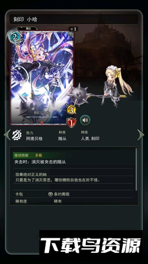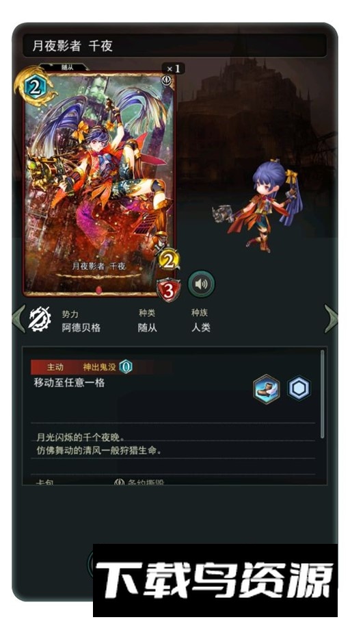 消耗2点费用,属性为3点攻击与1点生命;技能可消灭处于夹击状态下的敌人。