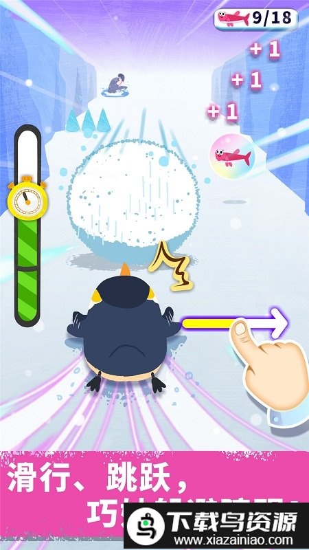 企鹅们的饭后活动开始了,一起滑雪吧;孩子需协助企鹅跳过石块、避开海豹、躲开滚落的雪球;成功吃到小鱼还能获得加速滑行的奖励。